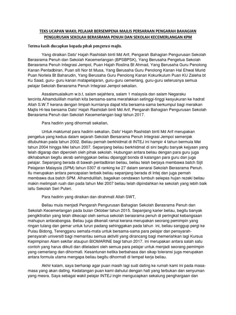 Yang diraikan tuan haji abdullah bin mohd. Yang dihormati encik abdul manaf bin ahmad, guru besar . Ucapan wakil pelajar terima kasih kepada tuan . Teks ucapan wakil pelajar sempena sambutan majlis persaraan guru. Yang berusaha en mohd zakariah bahari penolong kanan pentadbiran. , guru besar sk hosba yang diraikan, tuan hj ismail b. View ucapan wakil pelajar_majlis persaraan guru besar.docx from edu 2112 at mara university of technology. Teks ucapan wakil murid sempena hari guru. Terima kasih kepada saudara/i pengerusi majlis. Yang berusaha tuan pegawai ppd, encik. Assalamulaikum warah matullah hiwabarakatuh dan salam sejahtera. Teks ucapan wakil pelajar sempena sambutan majlis persaraan guru. Urusan adalah kualiti peribadi yang perlu dicontohi dan diteladani oleh kita semua terutama. Meraikan majlis perpisahan yang sangat bermakna dan .